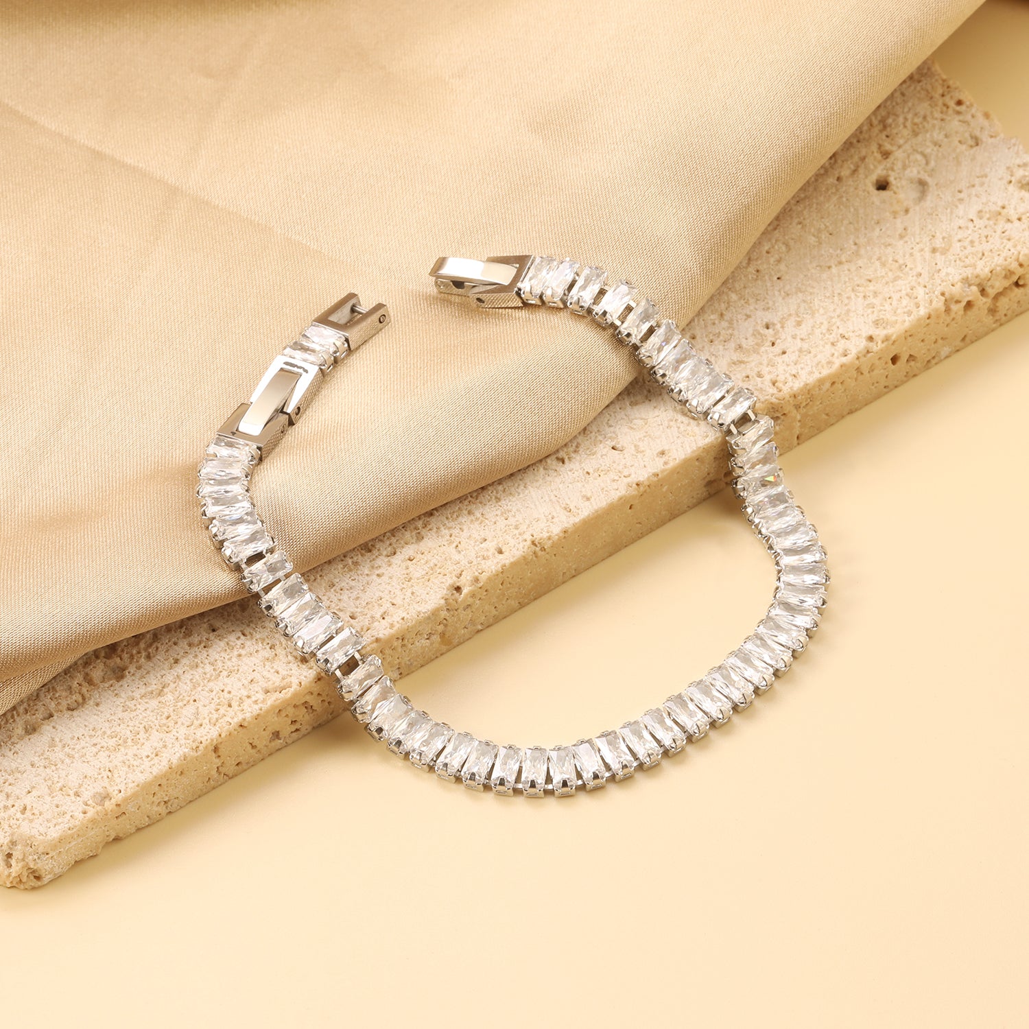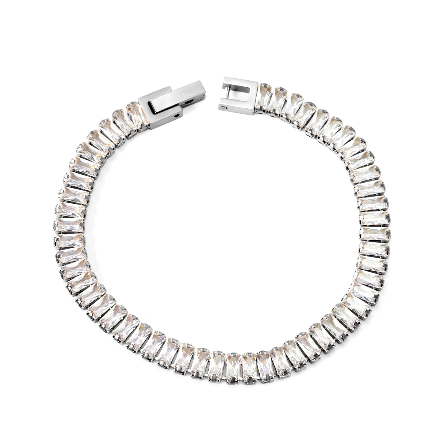 Material: Stainless steel, 18k gold or silver PVD coating, baguette-cut crystals